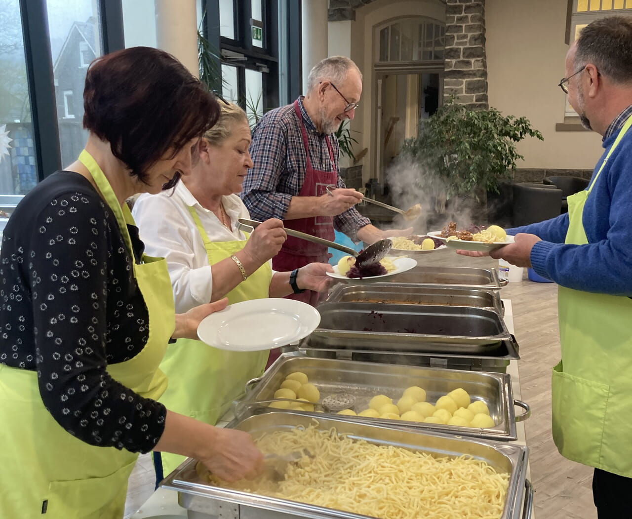 Seitdem gibt es Mitarbeiterinnen und Mitarbeiter, die einkaufen, Lebensmittel bei der Tafel abholen, Gemüse schneiden, kochen, servieren, kassieren, spülen, aufräumen und putzen. Mittlerweile sind es etwa 30 Ehrenamtliche, die sich unter der Leitung von Elke Schwandt und Thomas Völker um das leibliche Wohl der Gäste kümmern.