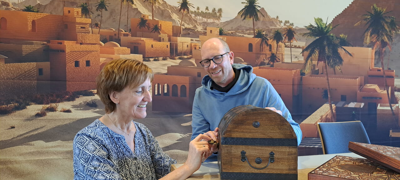 Man merkt schnell, dass hier eine Menge Herzblut im Spiel ist. Zum einen kommt Dekoration der eigenen Hochzeit des 2025 vermählten Paares zum Einsatz. Zum anderen bauen die Birkelbachs beide Szenarien jeden Monat auf. Denn in den Gemeinderäumen der Eichener Kirche findet das biblische Rätselraten an zwei Tagen im Monat statt. Danach verschwindet die Dekoration und mit ihr die Hochzeit nebst Ägypten wieder fein säuberlich verpackt im Schrank. „Es sind jedes Mal drei Stunden Aufbau, doch das ist es uns wert“, betont René Birkelbach. Er und seine Frau mögen Spiele und sind selbst bereits in Escape-Rooms gewesen.