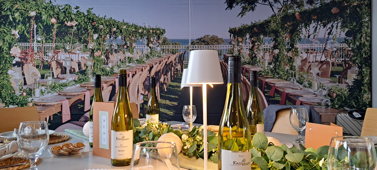 Dafür, dass Hochzeitsstimmung aufkommt oder Wüstenambiente genossen werden kann, sorgen übrigens auch riesige Fototapeten. „Wir haben uns die Originalbilder im Internet gekauft. Eine Firma, die normal LKW-Planen bedruckt, hat uns die Drucke angefertigt“, verrät Anja Birkelbach.