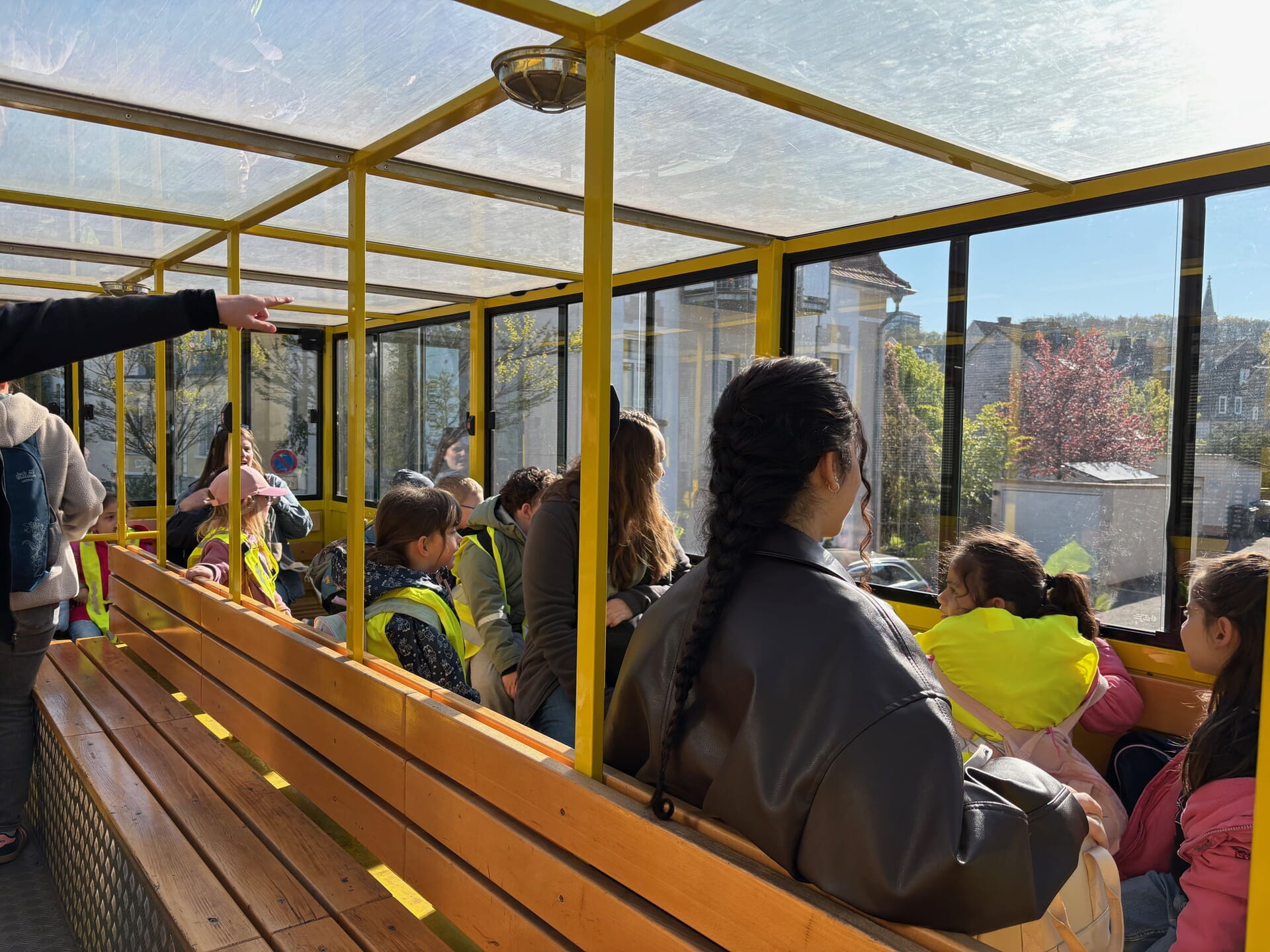 Und so waren die Kinder der Kita Herrenfeld nicht allein: Die zukünftigen Schulkinder der Evangelischen Kita Haardter Berg freuten sich ebenfalls zusammen mit ihren Erzieherinnen Pia Seelbach, Melanie Ziegenberg und Naemi Kramme auf die Fahrt mit dem legendären Bus. Kaum trafen sich beide Kitas, bog der Hübbelbummler auch schon um die Ecke. Die Erzieherinnen waren sich einig: Schon die Busfahrt war ein echtes Highlight. Das bestätigten die Kinder mit super Laune und leuchtenden Augen. Deren gute Laune konnten die Passanten, die den Hübbelbummler sahen, auch sehen: Die Kita-Kids winken fröhlich vom Panoramadach.