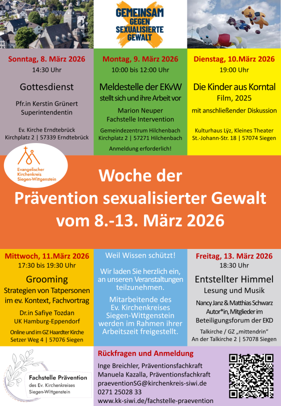 Die Fachstelle Prävention des Evangelischen Kirchenkreises Siegen-Wittgenstein lädt herzlich zur Informationswoche rund um das Thema Prävention sexualisierter Gewalt ein. Vom 8. bis 13. März 2026 erwarten Sie unterschiedliche Veranstaltungen von Gottesdienst, Fachvorträgen und Filmvorführung sowie einer Autorenlesung.